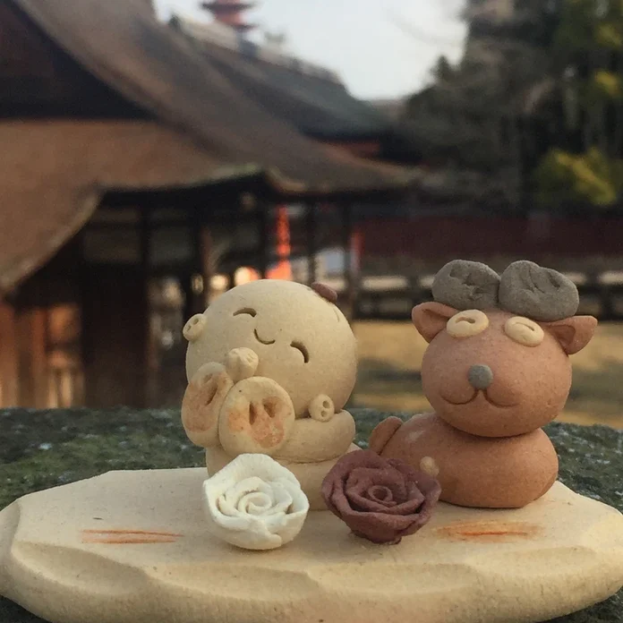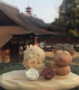 厳島劇場について ホームページをお訪ねくださり、ありがとうございます。厳島劇場は広島県廿日市市宮島町にあるセレクトショップで、歴史が好きな私と温かさを感じる手作り作品が好きな相方と二人で営んでいます。歴史的な建造物を前に、平清盛公や毛利元就をはじめとする人気の戦国武将商品、オリジナル招き猫、作家の手によるアート作品等を多数揃えています。壁面には、トリックアートや厳島の戦いをイメージした墨絵を設置して、宮島を模した背景の前で騎馬の写真が撮れます。(撮影無料です)店内には椅子もありますので、お気軽に立ち寄りください。 代表者 岡本恵一桟橋から歩いて約15分。厳島神社の裏側にある小川沿いに大願寺方向へ来てね。川土手では僕たちものんび~り。目印は朱色の円い反橋(そりばし)。反橋の川向いにある白壁の店で僕たちのぬいぐるみが待っているよ。 無料フォトスポットとして利用可能 厳島劇場にしかない撮影スポット。小道具も自由に使えて撮影無料です。宮島の思い出づくりの1ページにご利用ください。 厳島の戦い 墨絵 厳島の戦いは、1555年10月1日 毛利元就と陶晴賢との間で行なわれた合戦で日本三奇襲作戦の一つとされています。墨絵はそれをイメージし、中央に毛利元就を、左に小早川隆景、右に吉川元春を描いています。 オリジナルトリック3Dアート 毛利元就・真田幸村の兜・甲冑を身に付け、刀を持って。現代の宮島に登場した戦国時代の武将と馬に乗って戦ってみよう!写真はかっこいい2人の兄弟競演です。 鹿さんと記念撮影 厳島劇場の玄関横ではぬいぐるみの鹿さんがお出迎え。気ままに抱っこして記念の1枚を撮ってくださいね。写真のお二人は東京から遊びにいらしていた綾香ちゃんとあやこちゃん。明るくてとっても可愛いお嬢さんです。 Item Catetory Miyajima Handcraft Goods・Item Samurai T-shirt Photo Information ホームページを公開しました 2022年3月5日